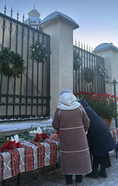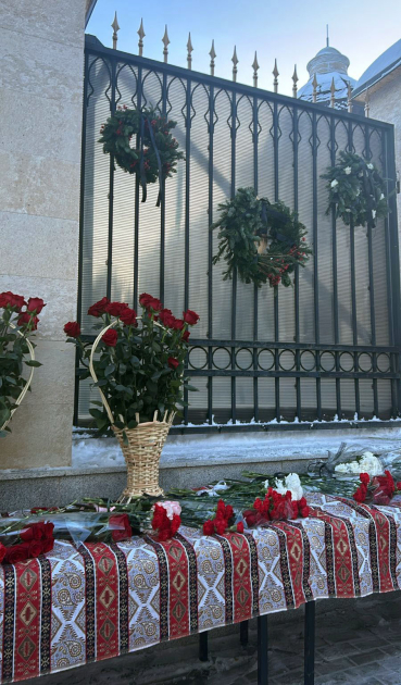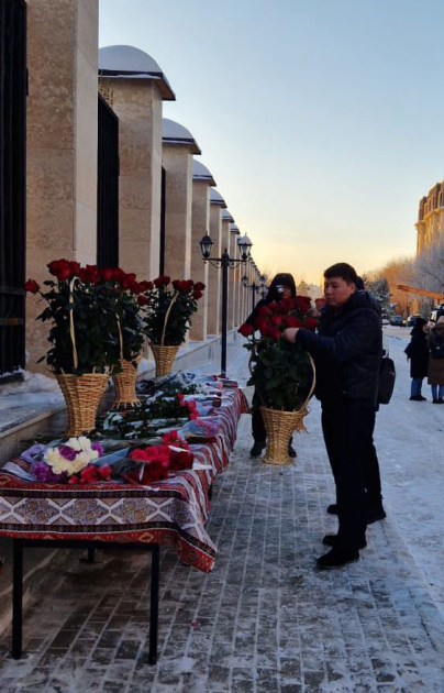 Astana sakinləri Azərbaycanın Qazaxıstandakı səfirliyi qarşısına gül dəstələri qoyurlar.