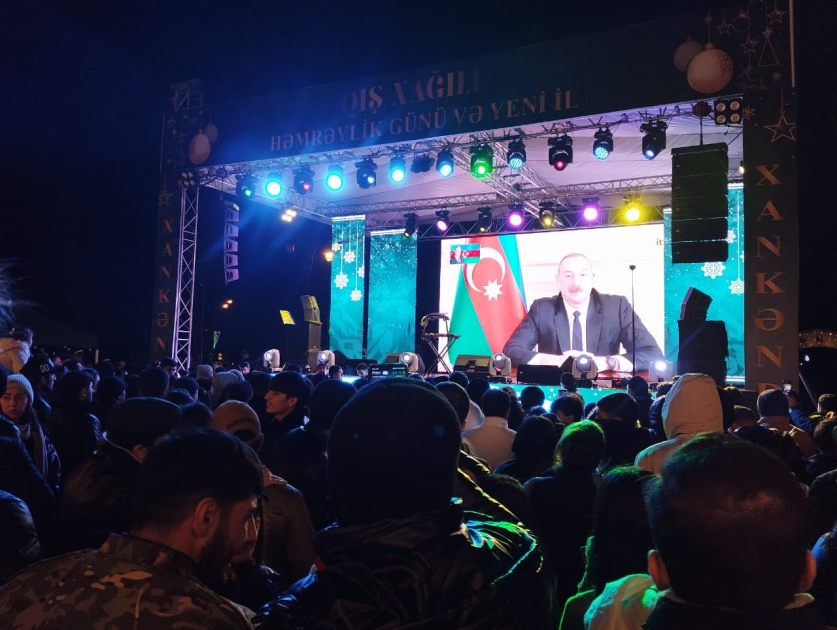 AZƏRTAC-ın bölgə müxbiri xəbər verir ki, Zəfər meydanına toplaşan insanlar böyük monitorda Prezident İlham Əliyevin Dünya Azərbaycanlılarının Həmrəyliyi Günü və Yeni il münasibətilə müraciətini dinləyiblər.