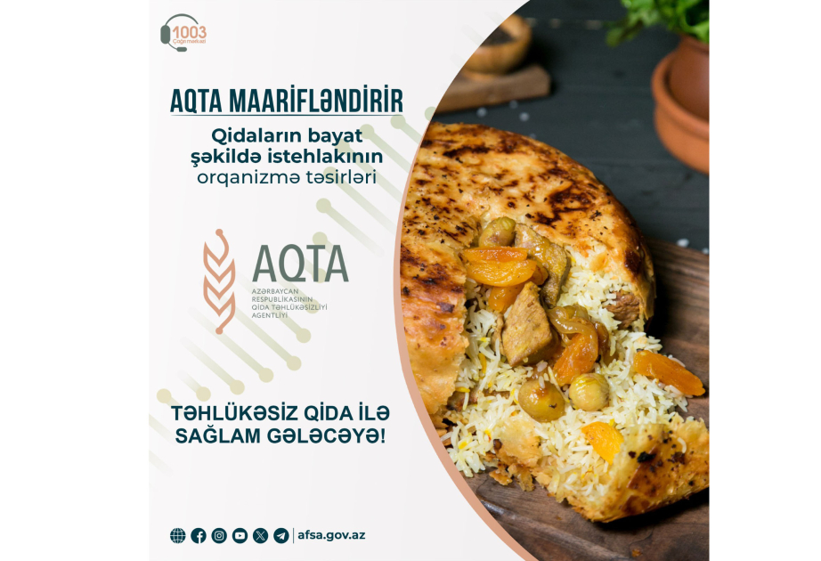 AZƏRTAC Azərbaycan Qida Təhlükəsizliyi Agentliyinə istinadən xəbər verir ki, bayram vaxtı istehlak edilməyən yeməklər bəzən israf olunmaması üçün sonrakı günlərə saxlanılır. Dəfələrlə qızdırılıb bayat şəkildə istehlak olunan yeməklərin isə orqanizmə bir sıra mənfi təsirləri ola bilər. Ona görə də bayram üçün hazırlanan qidaların istehlakı zamanı daha diqqətli olmaq lazımdır.