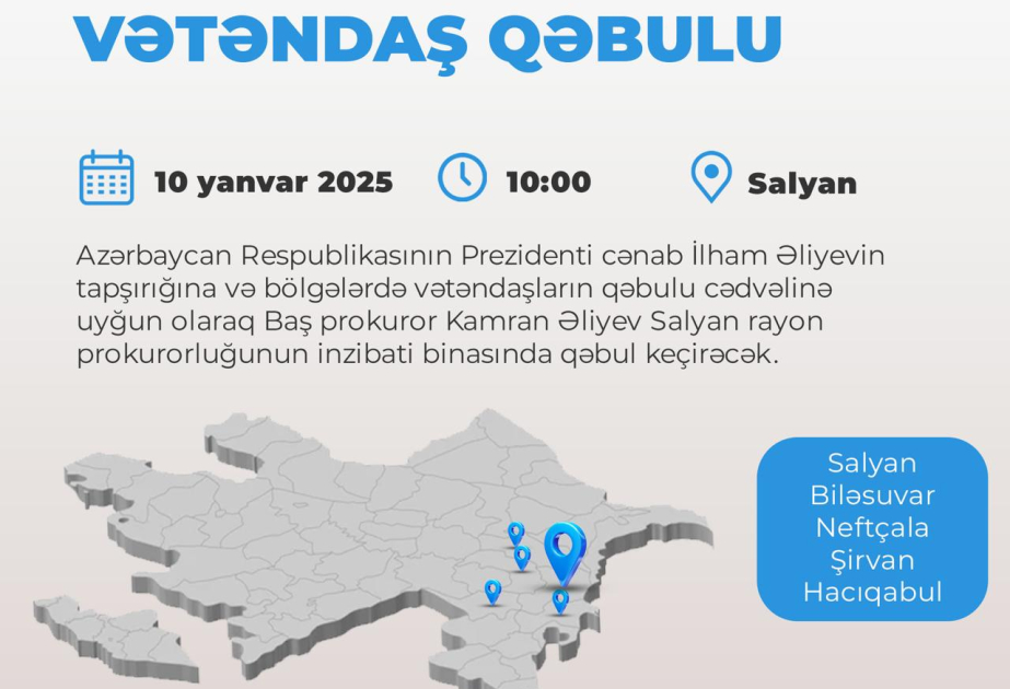 Azərbaycan Respublikasının Prezidenti İlham Əliyevin tapşırığına və bölgələrdə vətəndaşların qəbulu cədvəlinə uyğun olaraq Baş prokuror Kamran Əliyev cari il yanvarın 10-da saat 10:00-da Salyan Rayon Prokurorluğunun inzibati binasında Salyan, Biləsuvar, Neftçala, Hacıqabul rayon və Şirvan şəhər sakinlərini qəbul edəcək.