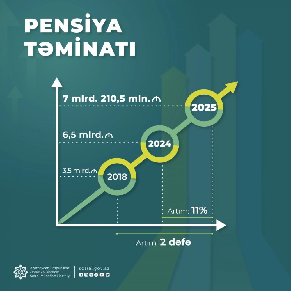 Sosial sahədə prioritet təminat sektoru kimi pensiya ödənişləri də mühüm yer tutur. Hökumət ardıcıl olaraq bu sahəyə böyük həcmdə maliyyə ayırmaları həyata keçirir. Həm minimum pensiyaların, həm də əmək pensiyalarının artımları davamlı xarakter daşıyır. 2025-ci ildən start verilən beşinci sosial islahat paketi çərçivəsində minimum pensiyanın məbləği 280 manatdan 320 manata çatdırılıb, yaxın günlərdə isə əmək pensiyalarının artımı təmin olunacaq.