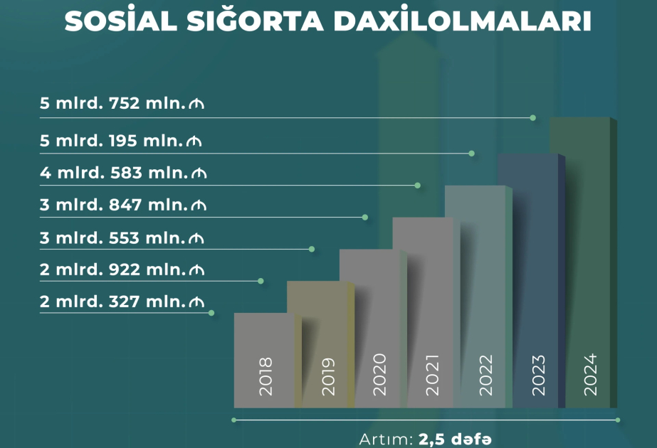 Nazirliyin İctimaiyyətlə əlaqələr şöbəsindən AZƏRTAC-a verilən məlumata görə, 2018-2024-cü illərdə Fonda daxil olan sosial sığorta haqları üzrə illik vəsait 2,5 dəfə artaraq 2 milyard 327 milyon manatdan 5 milyard 752 milyon manata çatıb.