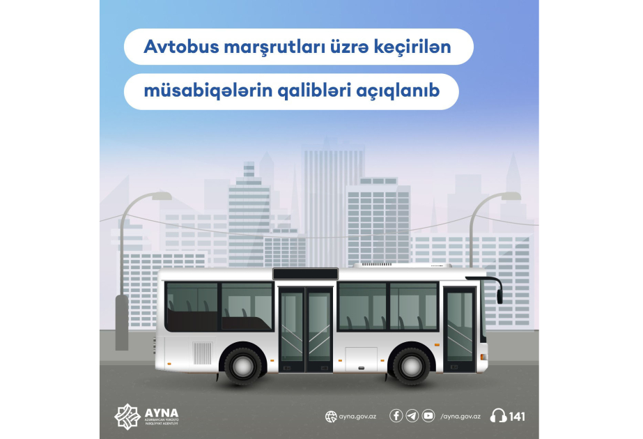 AYNA-dan AZƏRTAC-a bildirilib ki, 62 nömrəli marşrut üzrə (Sabunçu qəsəbəsi, dəmiryolu stansiyası – N.Tusi küçəsi) hüquqi şəxs “BakuBus” MMC; 217 nömrəli marşrut üzrə (Məmmədli kəndi – "Koroğlu" Nəqliyyat Mübadilə Mərkəzi) hüquqi şəxs “BakuBus” MMC; 569 nömrəli marşrut üzrə (Masazır qəsəbəsi – Bakı Beynəlxalq Avtovağzal Kompleksi) hüquqi şəxs “Xan Nəqliyyat R” MMC komissiya üzvləri tərəfindən qalib elan olunublar.