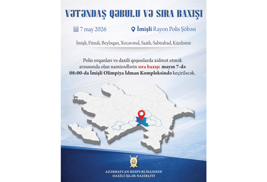 Polis orqanları və daxili qoşunlarda xidmət etmək arzusunda olan namizədlərin sıra baxışı mayın 7-də saat 08:00-da İmişli Olimpiya İdman Kompleksində keçiriləcək.