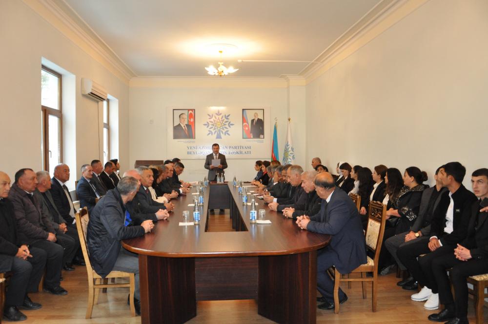 Tədbiri giriş sözü ilə açan YAP Beyləqan rayon təşkilatının sədri Müşfiq Səfərov bildirdi ki, dahi şəxsiyyət Heydər Əliyevin yaradıcısı olduğu, bu gün möhtərəm Prezidentimiz İlham Əliyevin uğurla rəhbərlik etdiyi Yeni Azərbaycan Partiyası ötən 32 ildə çətin və şərəfli yol keçib. Yeni Azərbaycan Partiyasının 32 illik tarixi Azərbaycanın dövlət müstəqilliyinin inkişafı tarixidir. 21 noyabr 1992-ci il müasir Azərbaycan tarixinə yazılan unudulmaz tarixi bir gündür. Həmin gün yenicə dövlət müstəqilliyini qazanmış və böyük faciələrlə üzləşmiş Azərbaycan Respublikasının məhv olmaqdan xilasının əsası qoyulub. 2021-ci ilin mart ayının 5-də keçirilən Yeni Azərbaycan Partiyasının VII qurultayında qəbul edilən tarixi qərarlar isə ölkəmizin ictimai-siyasi həyatına yeniliklər gətirib, ölkəmizin gələcək inkişaf perspektivlərinin müəyyənləşdirilməsi baxımından mühüm rol oynayıb.