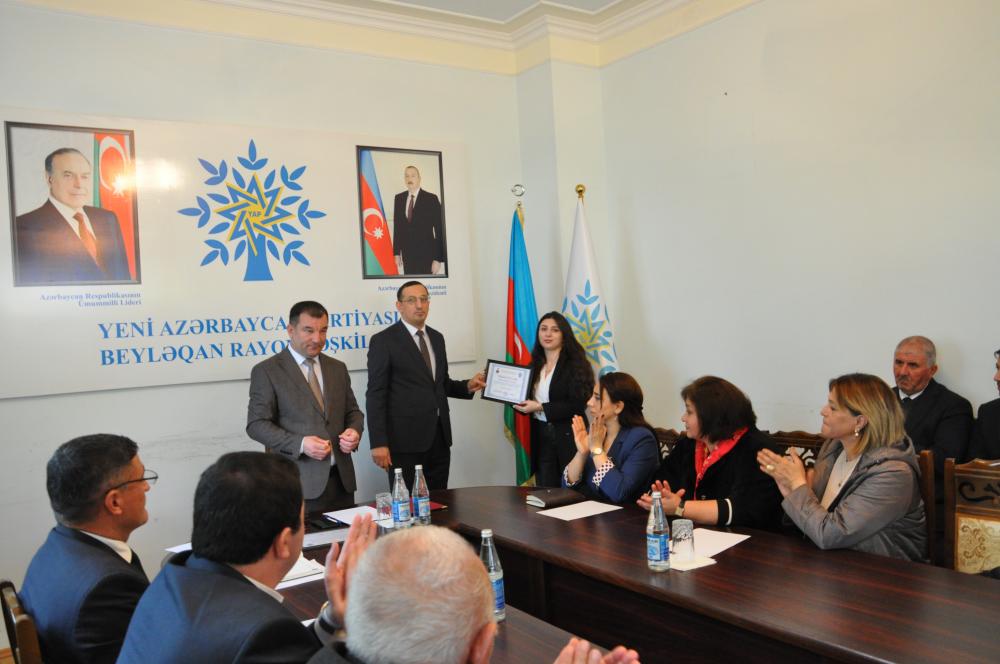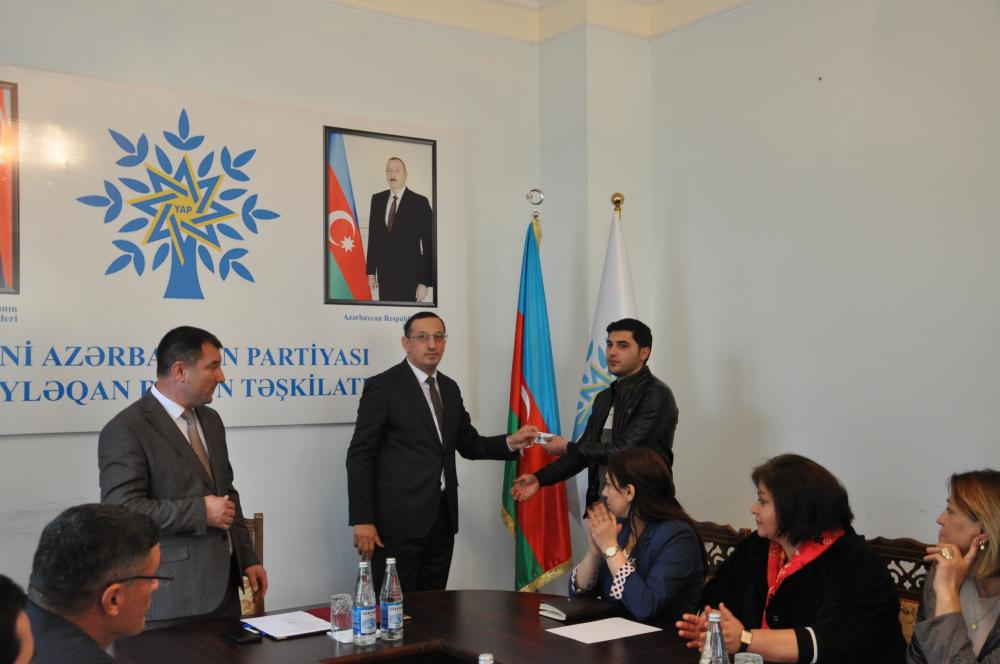 Tədbirin sonunda bir qrup gəncə yeni partiya vəsiqələri, bir qrup gəncə isə Rayon təşkilatının ictimai siyasi həyatında fəal iştirakına görə Təşəkkürnamə təqdim edildi.