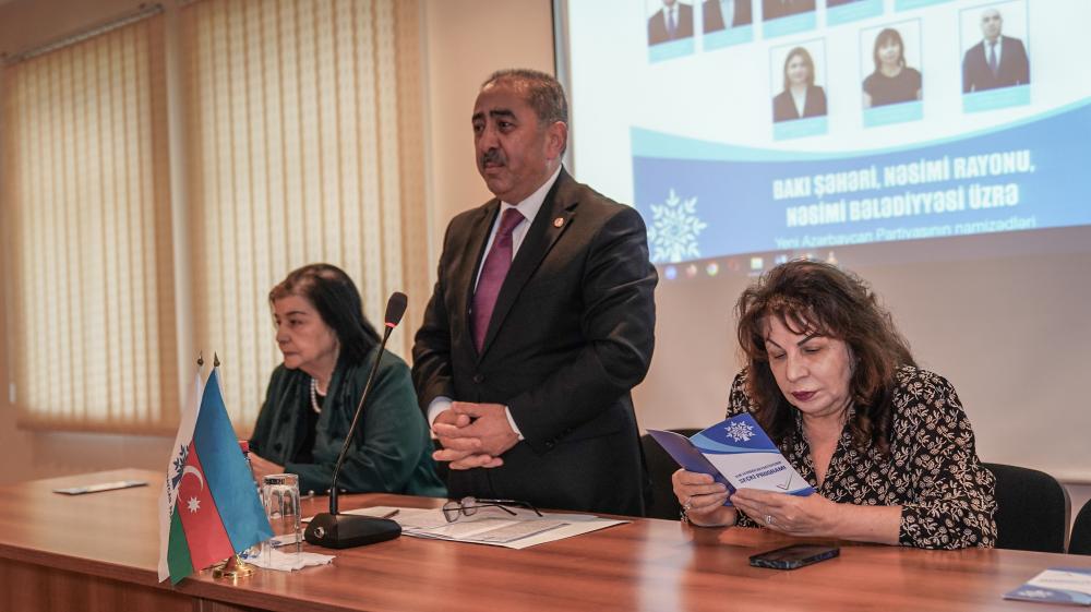 Görüşdə giriş sözü ilə çıxış edən Yeni Azərbaycan Partiyası Nəsimi rayon təşkilatının sədri Azər Süleymanov bələdiyyə institutunun yerli demokratiyanın göstəricisi olduğunu bildirib. O, çıxışında ölkəmizdə bələdiyyələrin yaranma tarixi, ötən dövr ərzindəki fəaliyyətləri, dövlətimiz tərəfindən yerli özünüidaəetmə orqanlarına göstərilən dəstək barədə məlumat verib. Təşkilat sədri yanvarın 29-da bələdiyyə seçkilərinin tam şəffaf və demokratik şəraitdə keçirilməsinə hər cür şərait yaradıldığını bildirib.