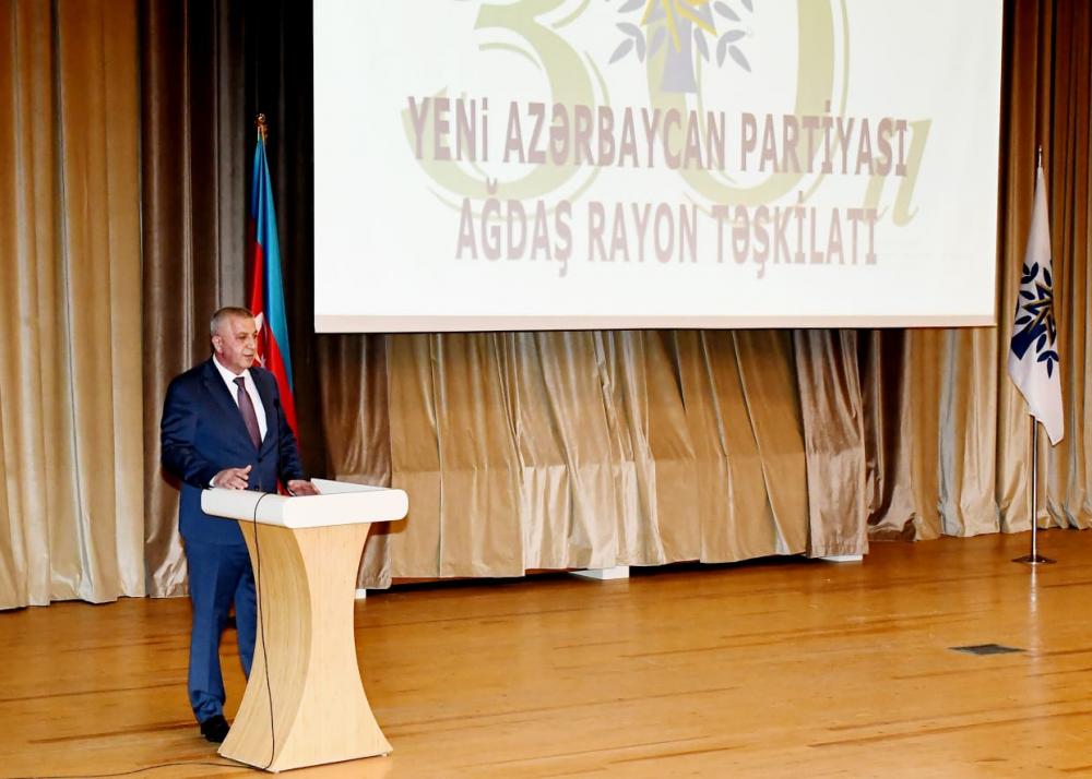 Yeni Azərbaycan Partiyası Ağdaş rayon təşkilatının sədri Əlişah Rəcəbov geniş məruzə ilə çıxış edərək Yeni Azərbaycan Partiyasının yaranması və keçdiyi şərəfli tarixi yoldan danışıb. Yeni Azərbaycan Partiyası Ağdaş rayon təşkilatının fəaliyyəti haqqında, təşkilatın 30 il ərzində rayonun ictimai-siyasi həyatında tutduğu mövqedən bəhs edib.