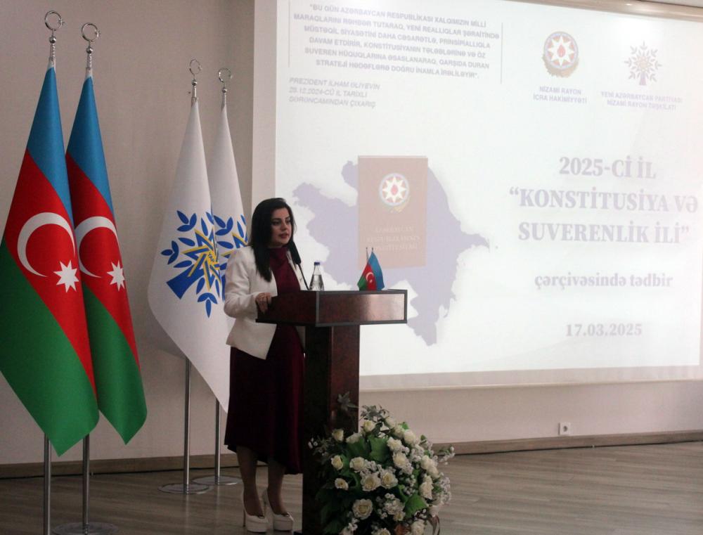 Tədbirdə çıxış edən məşhur “91”lərin üzvü, Milli Məclisin deputatı, “İki sahil” qəzetinin baş redaktoru Vüqar Rəhimzadə, Milli Məclisin deputatı Pərvanə Vəliyeva, Nizami Rayon İcra Hakimiyyəti başçısının müavini İldırım Mehdiyev, Yeni Azərbaycan Partiyası Nizami rayon təşkilatının sədri Ramil Vəlibəyov və başqaları bildiriblər ki, 2025-ci ildə Azərbaycan Respublikasının Konstitusiyasının qəbulunun 30 illik, həmçinin Vətən Müharibəsində qazanılmış Zəfərin 5 illik yubileyi qeyd olunur. Bu münasibətlə 2024-cü ilin 28 dekabr tarixində Prezident İlham Əliyevin Sərəncamı ilə ölkəmizdə “Konstitusiya və Suverenlik İli” elan edilib. Sərəncamda da qeyd olunduğu kimi bu gün Azərbaycan Respublikası xalqımızın milli maraqlarını rəhbər tutaraq, yeni reallıqlar şəraitində müstəqil siyasətini daha cəsarətlə, prinsipiallıqla davam etdirir, Konstitusiyanın tələblərinə və öz suveren hüquqlarına əsaslanaraq, qarşıda duran strateji hədəflərə doğru inamla irəliləyir.
