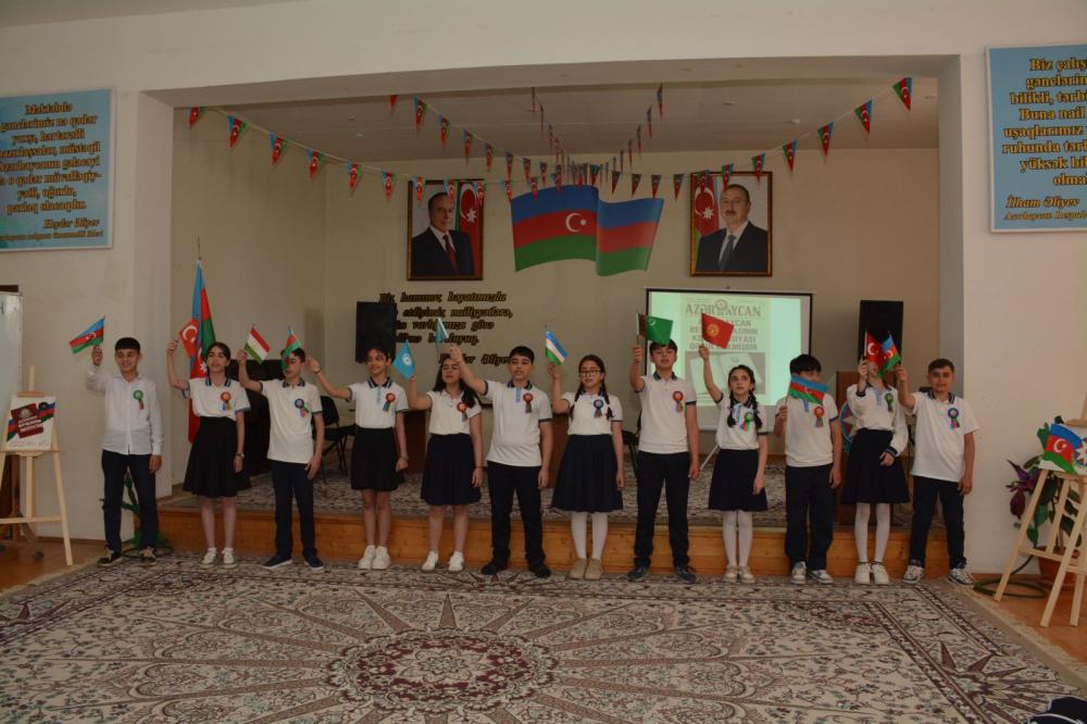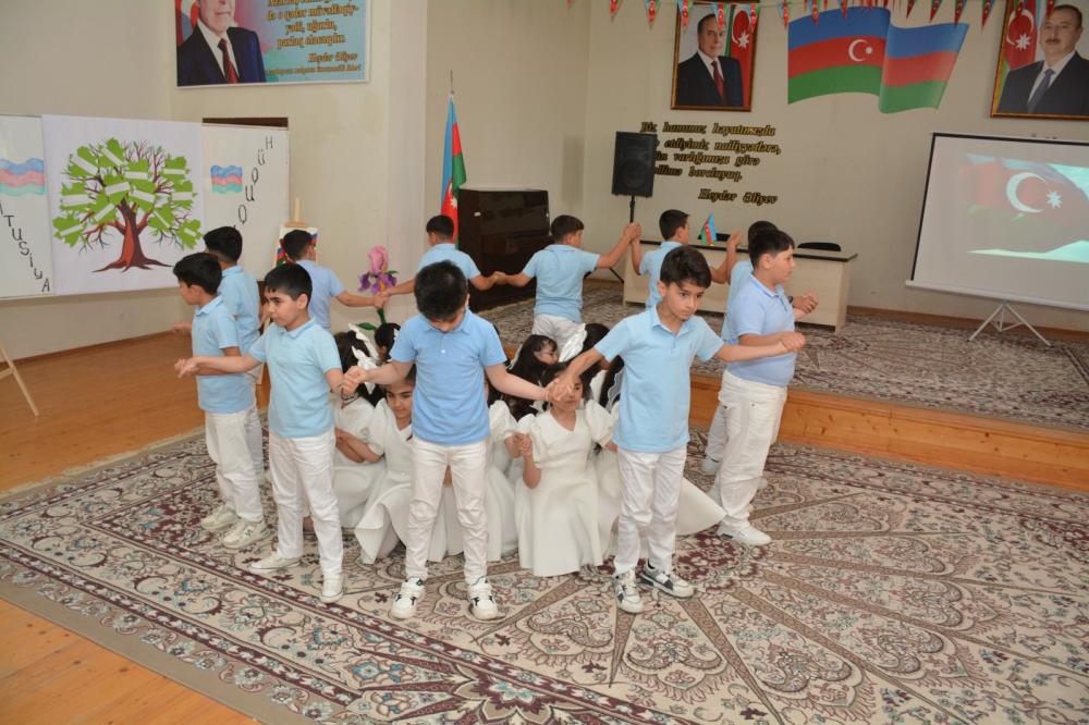 Sonra 4-cü b sinfinin şagirdlərinin ifasında "Yaşa Azərbaycan" mahnısı ifa edilərək Azərbaycan bayrağı səhnəyə gətirilib.