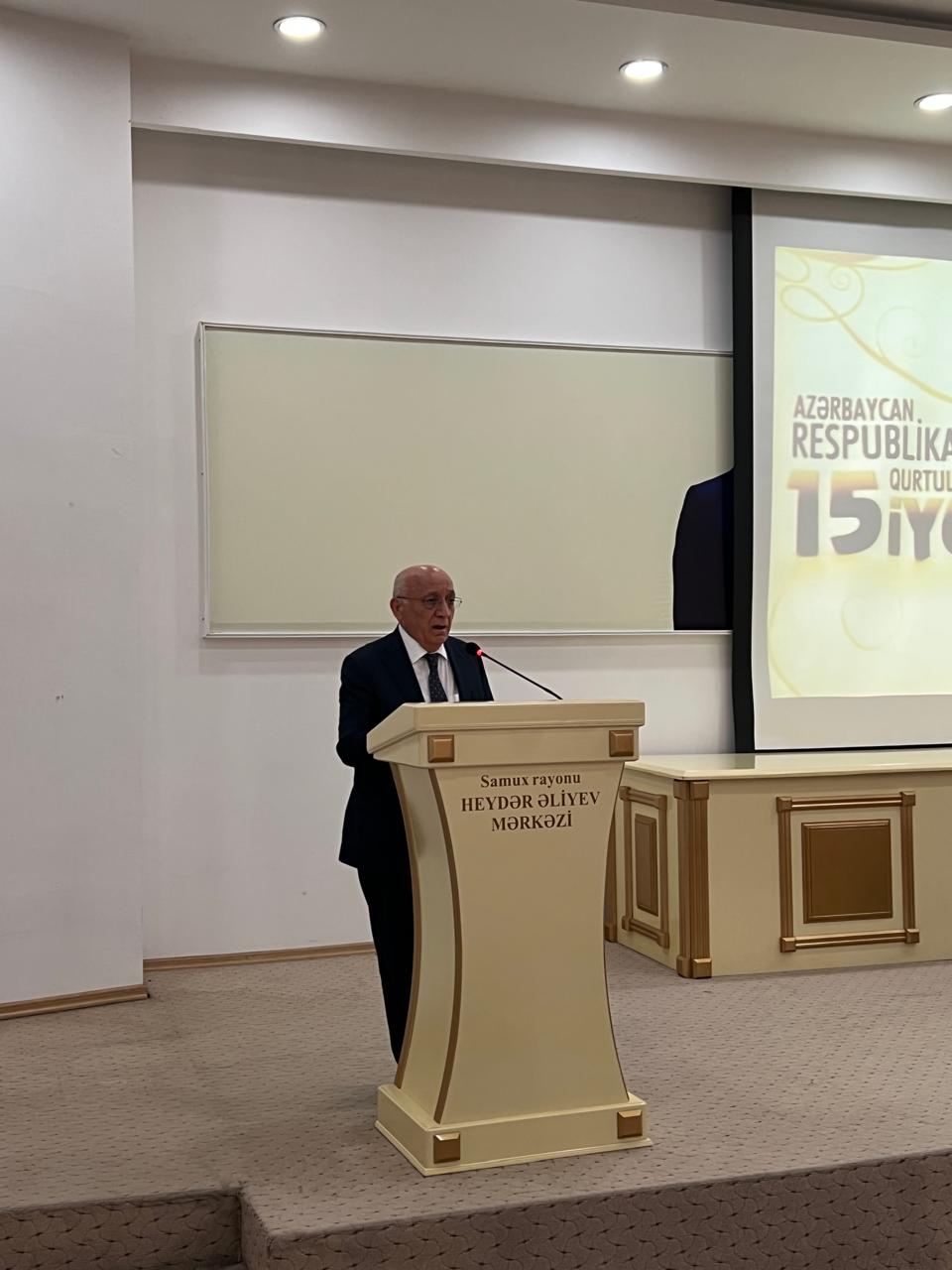 Samux rayon İcra Hakimiyyətinin başçısı Firdovsi Əliyev çıxış edərək öncə tədbir iştirakçılarını 15 iyun - Milli Qurtuluş Günü münasibətilə təbrik edib. O bildirib ki, 1993-cü ilin 15 iyununda Ulu Öndərin hakimiyyətə qayıdışı ilə Azərbaycanın tarixində yeni mərhələ başlayıb. O, Heydər Əliyevin Azərbaycanı bütün çətinliklərdən xilas edərək ölkəmizin inkişaf yoluna qədəm qoyması, mühüm siyasi və iqtisadi islahatların həyata keçirilməsindəki misilsiz töhfələrindən bəhs edib.