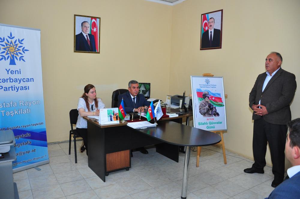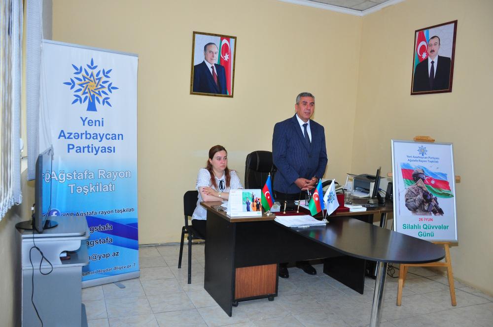 Tədbiri giriş sözü ilə açan “Gənclər və İdman idarəsi” Ərazi Partiya Təşkilatının sədri Turan Hüseynov qeyd edib ki, Azərbaycan Respublikası Silahlı Qüvvələrinin yaradılması müstəqil Azərbaycanın dövlət quruculuğunun mühüm nailiyyətlərindən biridir. Heydər Əliyevin 1993-cü ildə xalqın təkidli tələbi ilə hakimiyyətə gəlməsi və Azərbaycan Respublikasının Prezidenti seçilməsi hərb sahəsində vəziyyəti kökündən dəyişdirdi. Ümummilli liderin rəhbərliyi altında respublikamızda ordu quruculuğu sahəsində həyata keçirilən mühüm tədbirlər nəticəsində vahid komandanlığa tabe olan nizami ordu yaradıldı, cəbhədə vəziyyətin müsbət istiqamətdə inkişafı təmin edildi. Qeyri qanuni silahlı dəstələr ləğv edildi. Ulu Öndər Heydər Əliyevin 1998-ci il 22 may tarixli fərmanı ilə Azərbaycan Xalq Cümhuriyyəti hökümətinin ilk hərbi hissəni təsis etdiyi gün – 26 iyun hər il Azərbaycan Silahlı Qüvvələri günü kimi qeyd edilir.