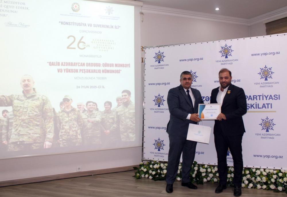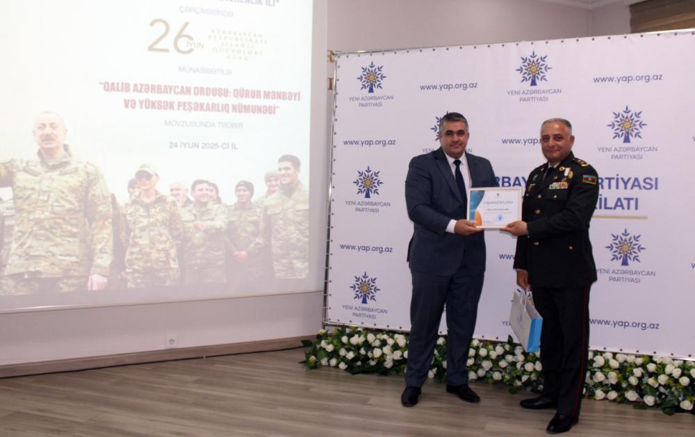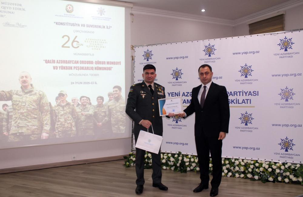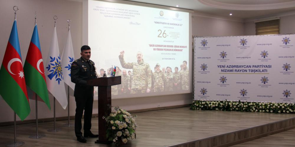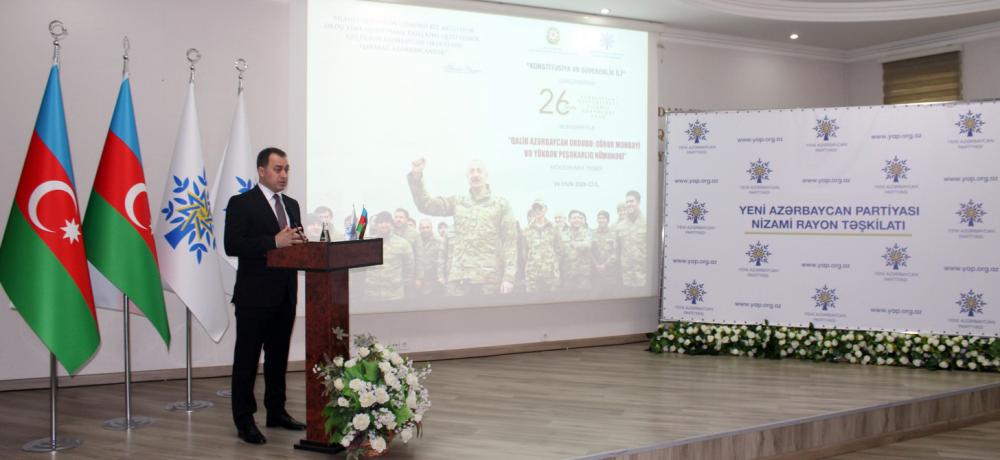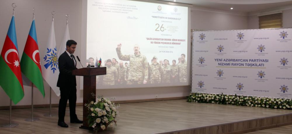 Nizami Rayon İcra Hakimiyyətinin və Yeni Azərbaycan Partiyası Nizami rayon təşkilatının birgə “Konstitusiya və Suverenlik İli” çərçivəsində 26 iyun - Azərbaycan Respublikası Silahlı Qüvvələri günü münasibətilə “Qalib Azərbaycan Ordusu: qürur mənbəyi və yüksək peşəkarlıq nümunəsi” mövzusunda tədbir keçirib.