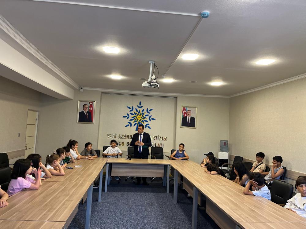 Yay məktəbi”nin üçüncü günü uşaqlar YAP Gəncə şəhər təşkilatının qərargahında Dini Qurumlarla İş üzrə Dövlət Komitəsinin Gəncə bölgəsi üzrə şöbəsinin əməkdaşı Elmar Fətəliyev ilə görüşüblər. Görüş zamanı Həsən Məmmədov uşaqlara dinimiz, onun mahiyyəti və əxlaqi dəyərləri barədə ətraflı məlumat verib. Onlara milli-mənəvi dəyərlərimizin qorunmasının əhəmiyyəti, İslamın insanları sülhə, mərhəmətə və dürüstlüyə çağırdığı izah edib. Bu söhbət uşaqlarda həm dini biliklərini artırıb, həm də onlarda milli kimliyimizə və mənəvi irsimizə daha böyük maraq yaradıb.