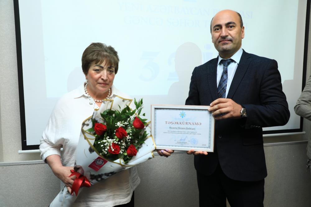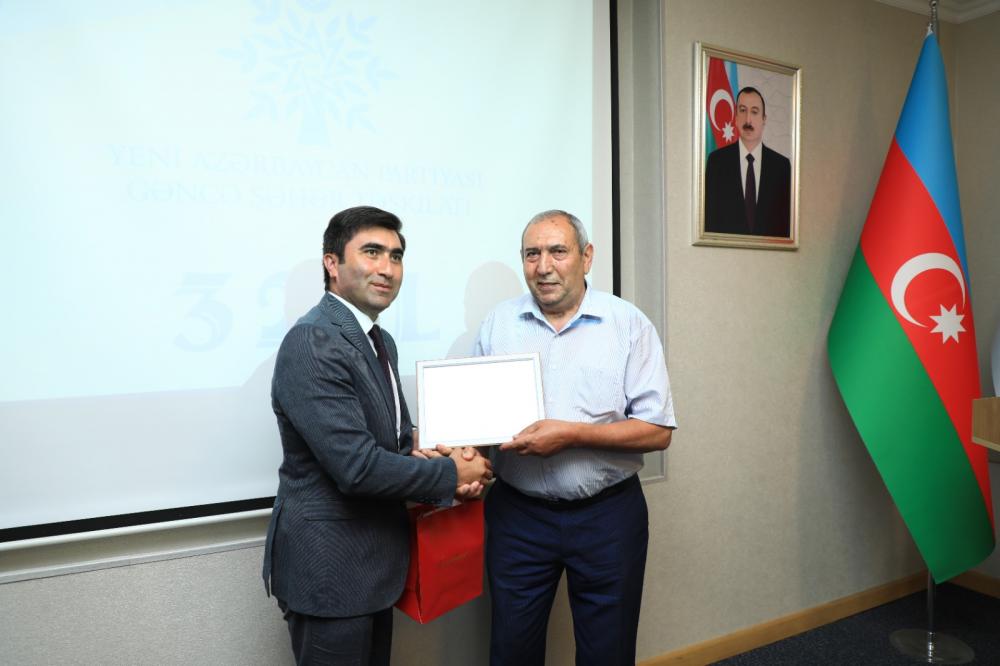 Gəncə şəhərinin ictimai-siyasi həyatında fəal iştirakına görə bir qrup partiya üzvünə fəxri fərman, partiya sıralarına yeni qoşulanlara üzvlük vəsiqəsi təqdim olunub.