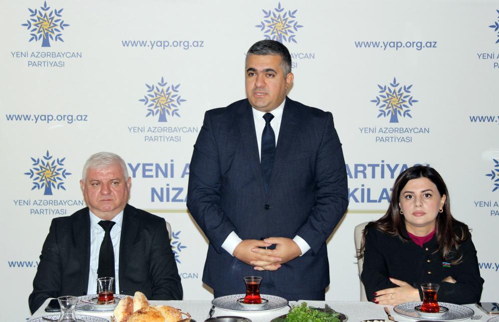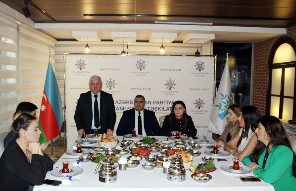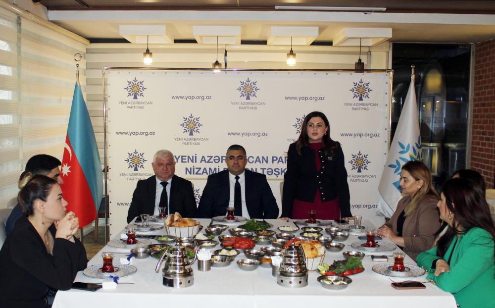 Çıxış edən Yeni Azərbaycan Partiyası Nizami rayon təşkilatının sədri Ramil Vəlibəyov, Milli Məclisin deputatı Pərvanə Vəliyeva, Nizami Rayon İcra Hakimiyyətinin İctimai-siyasi və humanitar məsələlər şöbəsinin müdiri Bəhman Hüseynov və başqaları tədbir iştirakçılarını əlamətdar gün münasibətilə təbrik və fəaliyyətlərinə görə təşəkkür edib, onlara uğurlar arzulayıblar.