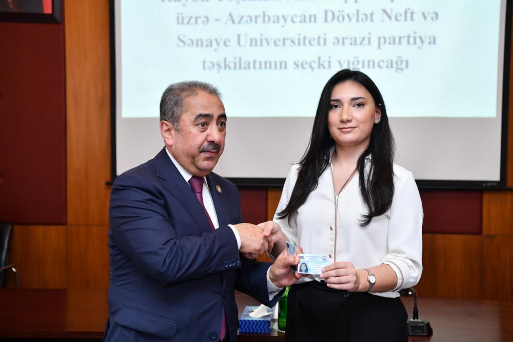 Hesabat-seçki yığıncağında həmçinin, ADNSU-nun Yeni Azərbaycan Partiyasına üzv olan 3 nəfər tələbəsinə partiya biletləri təqdim olunub.