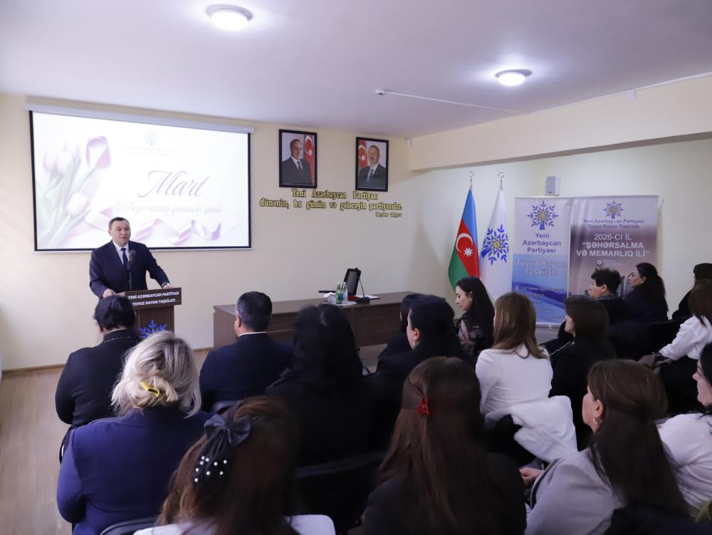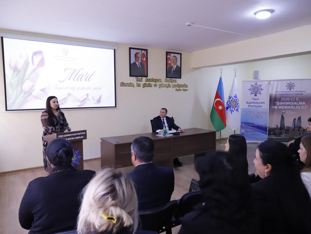 Tədbirdə çıxış edən YAP Tovuz rayon təşkilatının sədri Nihad Pənahov qadınları bayram münasibətilə təbrik edərək bildirib ki, Azərbaycan qadını yüksək mənəvi dəyərlərin daşıyıcısı, ailənin və cəmiyyətin əsas dayağı olmuşdur. O qeyd edib ki, Ulu Öndər Heydər Əliyev hər zaman Azərbaycan qadınının cəmiyyət həyatında roluna yüksək qiymət vermiş, onların dövlət idarəçiliyində və ictimai-siyasi həyatda fəal iştirakını xüsusi diqqətdə saxlamışdır. Bu siyasətin bu gün Azərbaycan Respublikasının Prezidenti, Yeni Azərbaycan Partiyasının Sədri cənab İlham Əliyev tərəfindən uğurla davam etdirildiyi vurğulanıb.
