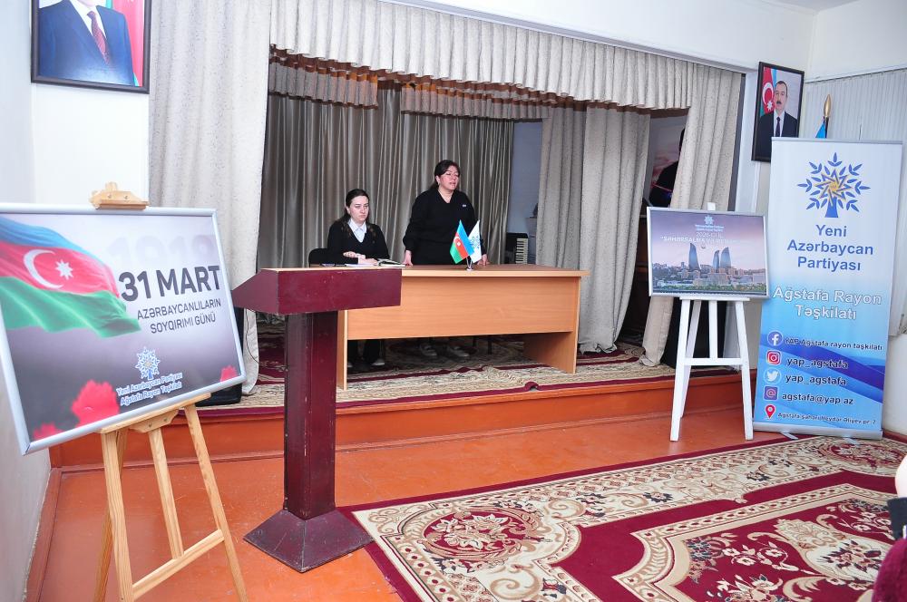Tədbiri giriş sözü ilə açan “Mədəniyyət işçiləri” Ərazi Partiya Təşkilatının fəal üzvü Göyçək Sadıxova qeyd edib ki, 1918-ci ilin 30 mart və 3 aprel tarixləri arasında Bakı şəhərində və Bakı quberniyasının müxtəlif bölgələrində, eləcə də Şamaxı, Quba, Xaçmaz, Lənkəran, Hacıqabul, Salyan, Zəngəzur, Qarabağ, Naxçıvan və digər ərazilərdə Bakı Soveti və daşnak erməni silahlı dəstələri azərbaycanlıları kütləvi şəkildə vəhşicəsinə qətlə yetirmişlər. Azərbaycan dövlət müstəqilliyini bərpa etdikdən sonra xalqımızın tarixi keçmişinin obyektiv mənzərəsini ortaya qoymaq imkanı yarandı. Ulu öndər Heydər Əliyevin “Azərbaycanlıların soyqırımı haqqında” 1998-ci il 26 mart tarixli Fərmanı ilə soyqırımı aktlarına siyasi-hüquqi qiymət verilməsi bu sahədə aparılan tədqiqatlara, həqiqətin üzə çıxarılması istiqamətində səylərin artırılmasına təkan verdi. Azərbaycan xalqına qarşı törədilmiş bütün soyqırımı faciələrini qeyd etmək məqsədilə 31 Mart Azərbaycanlıların Soyqırımı Günü elan edildi.
