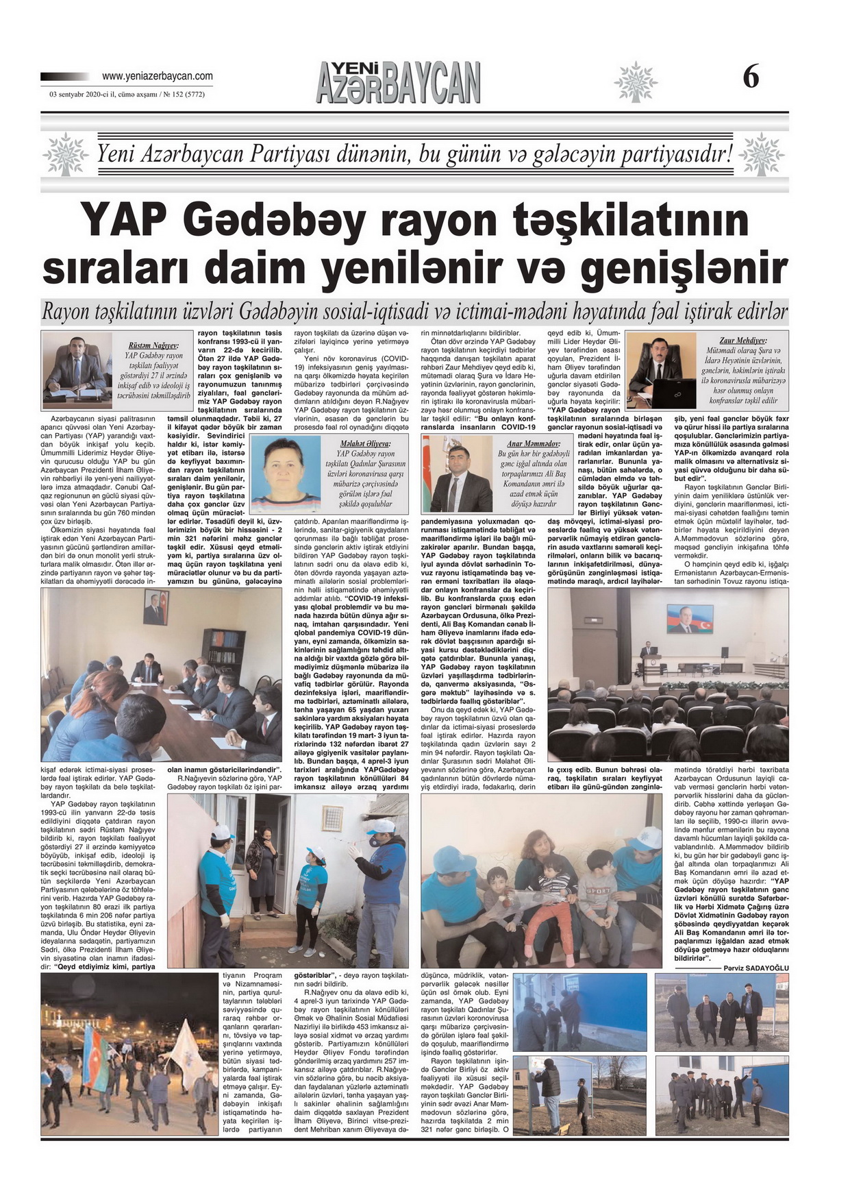 Ötən dövr ərzində YAP Gədəbəy rayon təşkilatının keçirdiyi tədbirlər haqqında danışan təşkilatın aparat rəhbəri Zaur Mehdiyev qeyd edib ki, mütəmadi olaraq Şura və İdarə Heyətinin üzvlərinin, rayon gənclərinin, rayonda fəaliyyət göstərən həkimlərin iştirakı ilə koronavirusla mübarizəyə həsr olunmuş onlayn konfranslar təşkil edilir: “Bu onlayn konfranslarda insanların COVID-19 pandemiyasına yoluxmadan qorunması istiqamətində təbliğat və maarifləndirmə işləri ilə bağlı müzakirələr aparılır. Bundan başqa, YAP Gədəbəy rayon təşkilatında iyul ayında dövlət sərhədinin Tovuz rayonu istiqamətində baş verən erməni təxribatları ilə əlaqədar onlayn konfranslar da keçirilib. Bu konfranslarda çıxış edən rayon gəncləri birmənalı şəkildə Azərbaycan Ordusuna, ölkə Prezidenti, Ali Baş Komandan cənab İlham Əliyevə inamlarını ifadə edərək dövlət başçısının apardığı siyasi kursu dəstəklədiklərini diqqətə çatdırıblar. Bununla yanaşı, YAP Gədəbəy rayon təşkilatının üzvləri yaşıllaşdırma tədbirlərində, qanvermə aksiyasında, “Əsgərə məktub” layihəsində və s. tədbirlərdə fəallıq göstəriblər”.