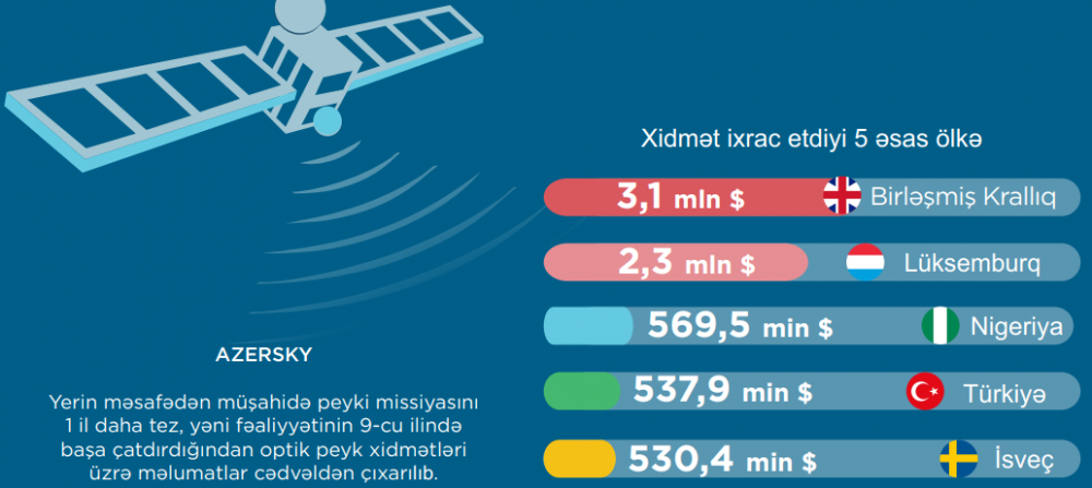 “Azərkosmos” 100-dən çox strateji önəmli kommersiya layihəsi həyata keçirib və öz maliyyə portfelini xidmət satışları hesabına gücləndirib. İlk peykin orbitə buraxılmasından 10 il sonra kosmik qurum 10 milyon dollarlıq biznes portfeli formalaşdırmağa nail olub. Son illərdə kosmik məhsulları ixracının coğrafiyası və həcmi də genişlənməkdədir. Məsələn, 2025-ci ilin yanvar-avqust aylarında “Azərkosmos” tərəfindən dünyanın 41 ölkəsinə 11,6 milyon dolları dəyərində telekommunikasiya xidməti ixrac edilib. Xidmət ixracından əldə edilən gəlirlər milli kosmik agentliyin ümumi gəlirlərinin 66 faizini təşkil edir. Peyk telekommunikasiya xidmətlərinin ixracının ilk beşliyində 3,1 milyon dollarla Birləşmiş Krallıq, 2,3 milyon dollarla Lüksemburq, 569,5 min dollarla Nigeriya, 537,9 dollarla Türkiyə, 530,4 min dollarla İsveç qərarlaşıb.