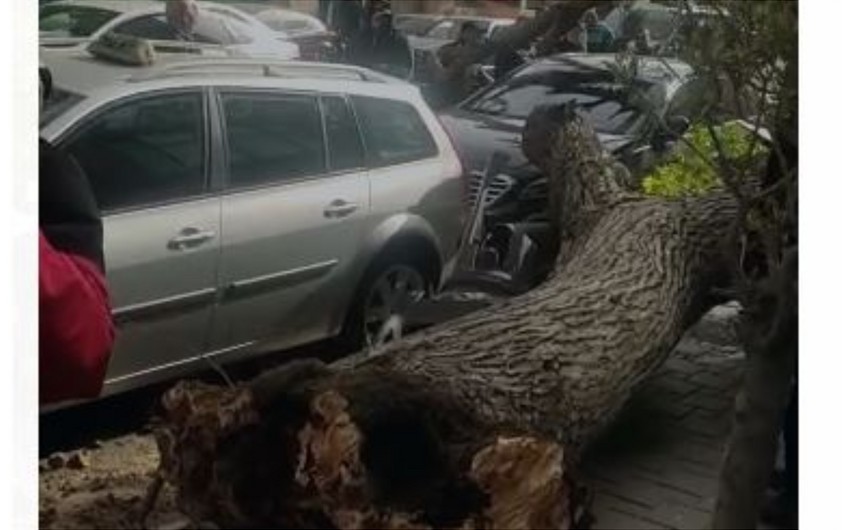 Güclü külək Bakıda nəhəng ağacı avtomobillərin üzərinə aşırıb