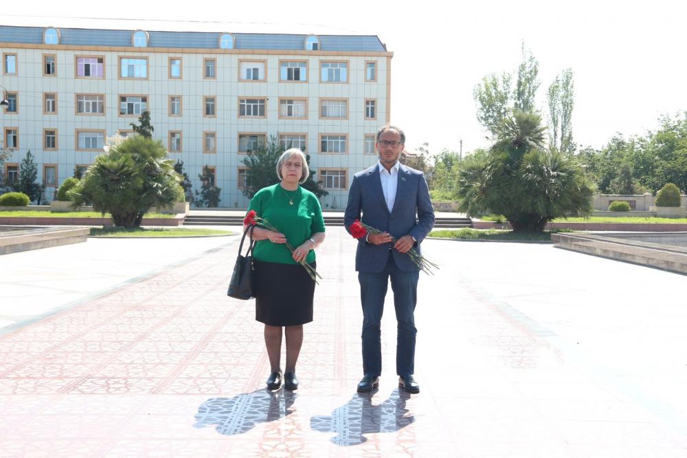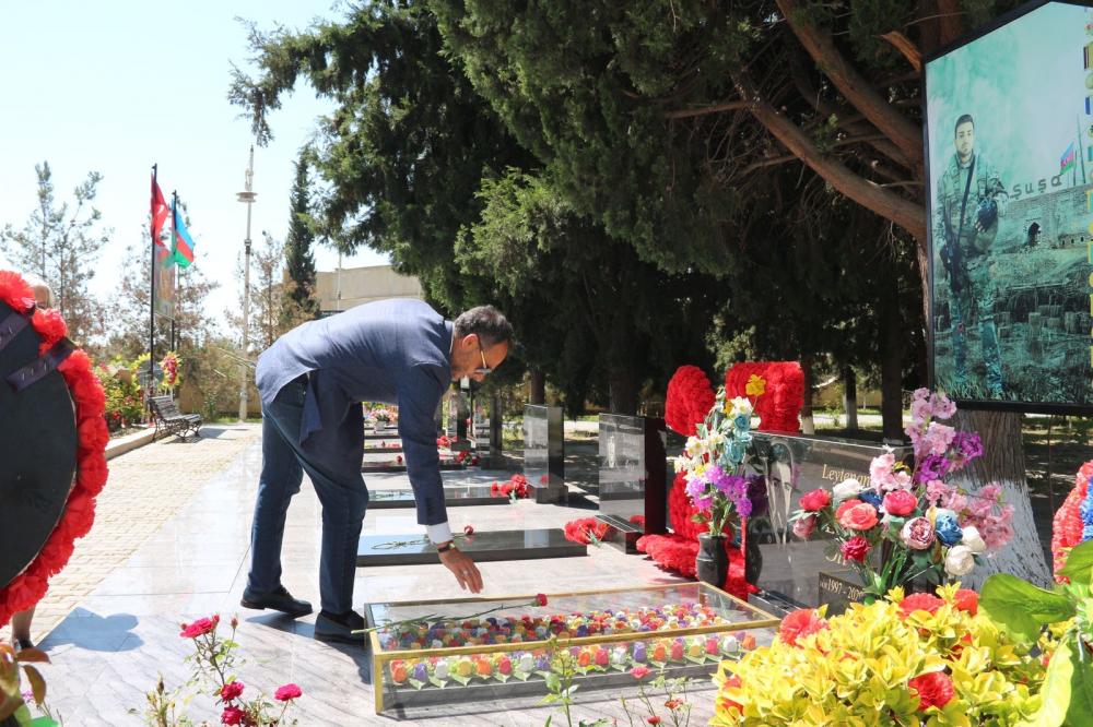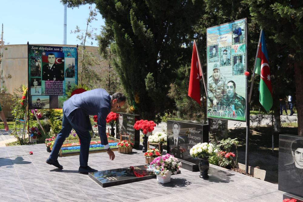 Daha sonra rayon mərkəzində yerləşən Şəhidlər xiyabanında Vətən uğrunda canlarını fəda etmiş şəhidlərimizin məzarları ziyarət edilib, xatirələri ehtiramla yad edilib.