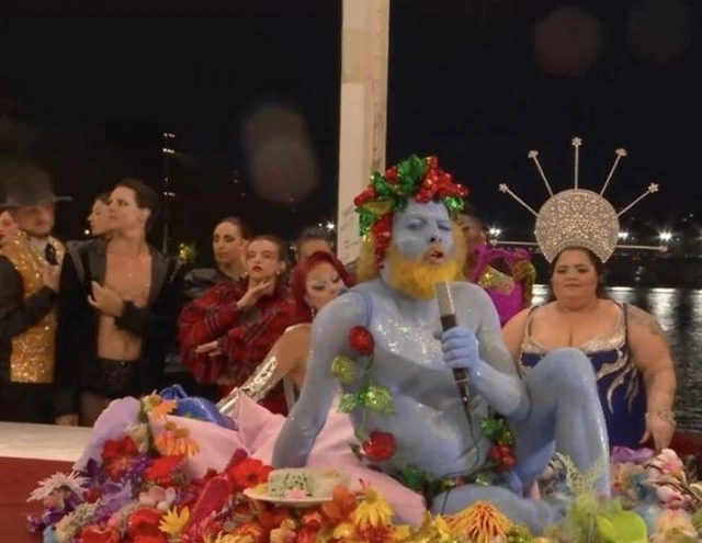 Bu səhnənin kulminasiyası nəhəng bir nimçənin üstündə mavi çalarlarla boyanmış çılpaq bir kişinin tamaşaçılar qarşısına çıxması olub. Bəli, Fransa həqiqətən parladı - Makronun nəzərinə çox xoş olan çılpaq maviliyi ilə. Bu səhnənin arxasında isə, Olimpiya məşəlini daşıyanlar arasında dreq-kvin (qadın obrazlarında kişi artistlər) adlanan üç nəfərin ortaya çıxması ilə özünü təzahür edən oxşar bir xətt dayanır.