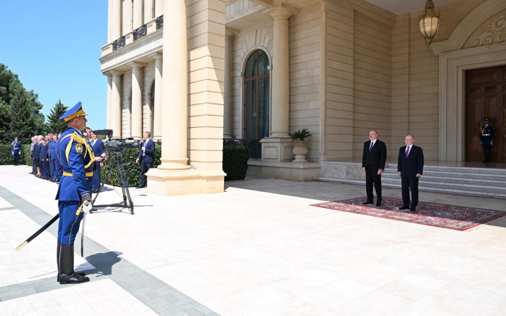 AZƏRTAC xəbər verir ki, hər iki ölkənin Dövlət bayraqlarının dalğalandığı meydanda Rusiya Prezidentinin şərəfinə fəxri qarovul dəstəsi düzülmüşdü.