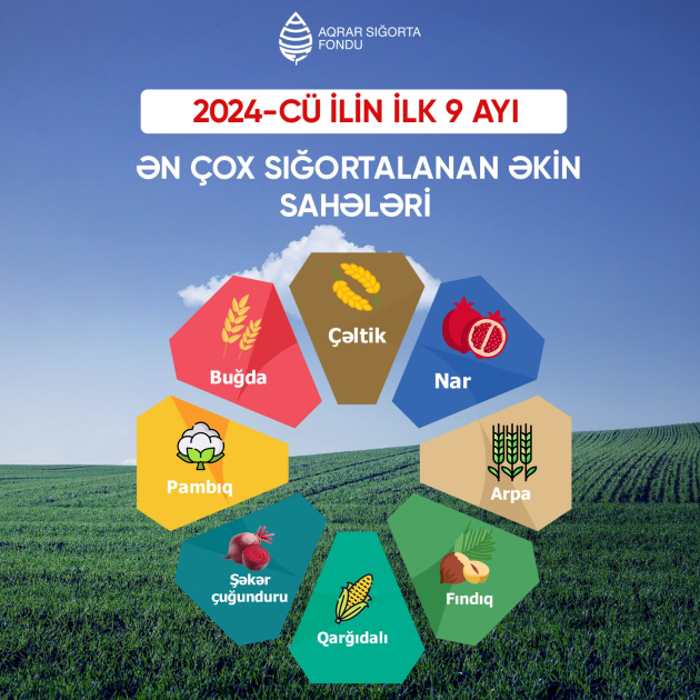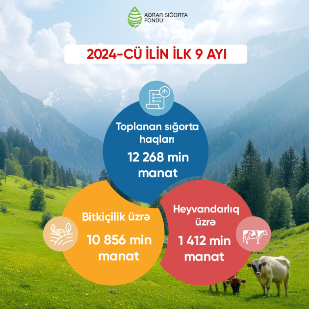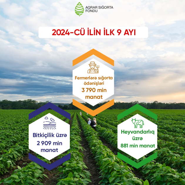 2024-cü ilin 9 ayı ərzində kənd təsərrüfatı əkinlərinin sığortası üzrə 10 milyon 856 min manat sığorta haqqı toplanıb və 457 milyon manat sığorta təminatı verilib.