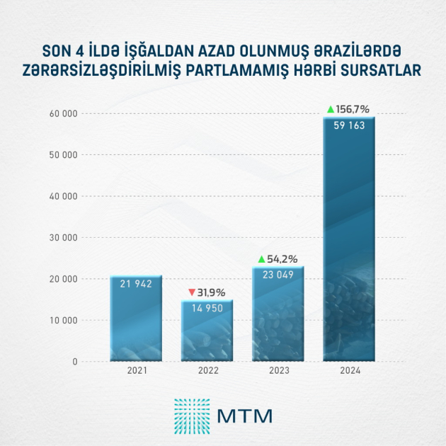 Son 4 il ərzində (2021-2024-cü illər) 179 min 186 hektar ərazi mina və partlamamış sursatlardan təmizlənib. 2020-ci ilin noyabr ayından ilin sonunadək təmizlənən 605,8 hektar ərazini də nəzərə alsaq, 2024-cü ilin sonuna kimi 179 min 791,8 hektar ərazinin mina və partlamamış sursatlardan tamamilə təmizləndiyini deyə bilərik. Ötən ildə isə işğaldan azad olunan ərazilərdə 62 min 23,9 hektar ərazi mina və partlamamış sursatlardan təmizlənib. Bu da əvvəlki ilin göstəricisi ilə müqayisədə 16,8 faiz çoxdur.