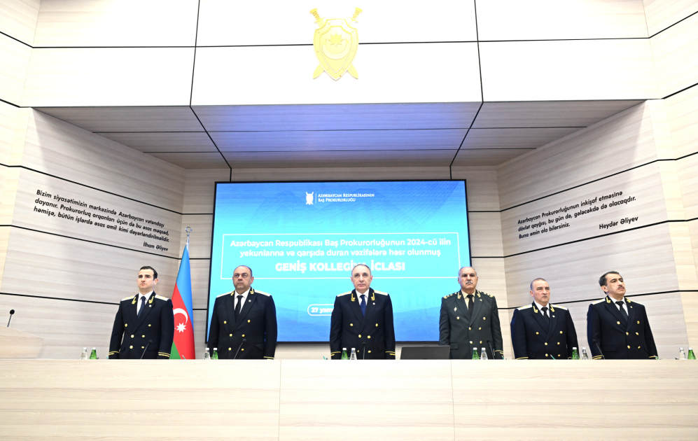 Azərbaycan Respublikasının Baş Prokurorluğunda Mərkəzi aparatın, Respublika Hərbi, Naxçıvan Muxtar Respublikası və Bakı şəhər prokurorluqlarının rəhbər heyətinin, rayon (şəhər) və ərazi hərbi prokurorlarının iştirakı ilə 2024-cü ildə prokurorluq orqanları tərəfindən cinayətkarlığa qarşı mübarizə, istintaq işi, prokuror nəzarəti sahələrində görülmüş işlərin vəziyyəti və qarşıda duran vəzifələrin müzakirəsinə həsr olunmuş geniş kollegiya iclası keçirilib.