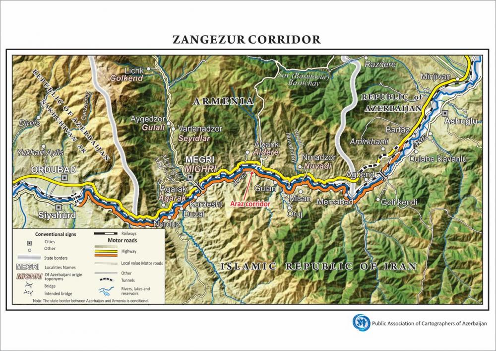 "Azərbaycan Kartoqrafları” İctimai Birliyi Zəngəzur dəhlizinin xəritəsini hazırlayıb. Xəritənin altlığı yüksək keyfiyyətli kosmik şəkillər əsasında tərtib edilib”.