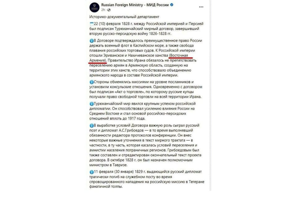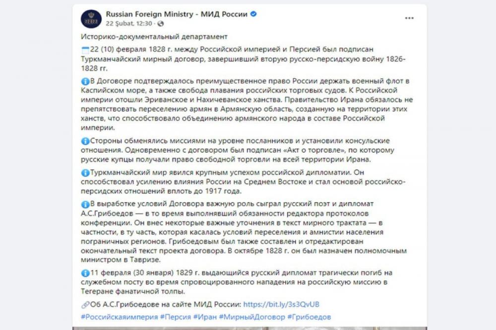Отметим, что 22 февраля на официальной странице МИД Российский Федерации в социальной сети была искажена информация о Туркманчайском договоре 1828 года.