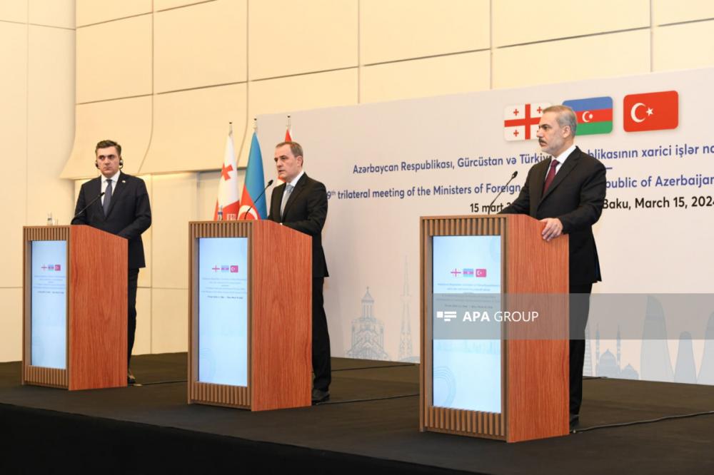 "Azərbaycan Respublikasının xarici işlər naziri, zati-aliləri Ceyhun Bayramovun dəvəti və Türkiyə Respublikasının xarici işlər naziri, zati-aliləri Hakan Fidan və Gürcüstanın xarici işlər naziri, zati-aliləri İlya Darçiaşvilinin iştirakı ilə üç ölkənin xarici işlər nazirlərinin Doqquzuncu Üçtərəfli Görüşü 15 mart 2024-cü il tarixində Bakıda keçirildi.