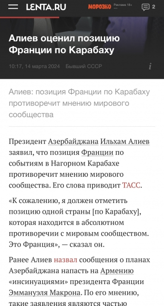 “Vestnik Qafqaza” agentliyi isə Azərbaycan Liderinin “İndi biz Ermənistanla heç vaxt olmadığımız qədər sülhə yaxınıq. Cənubi Qafqazın müstəqillik tarixində heç vaxt sülh bu qədər yaxın olmayıb” fikirlərini önə çıxararaq, Fransanın regionda sülhün bərqərar olması prosesinə maneə törətdiyini vurğulayıb. Prezident İlham Əliyevin Forumda çıxışına həsr olunmuş materialda, həmçinin bildirilir ki, rəsmi Bakı ermənilərin birtərəfli qaydada Qarabağa qayıtmaları ilə razılaşmır. Nə qədər ki, Makron erməni revanşizmini dəstəkləyir, Fransa vasitəçi statusuna namizəd ola bilməz və beləliklə, Aİ-nin Azərbaycan-Ermənistan münasibətlərinin nizamlanması prosesində iştirakı şansı azalır.