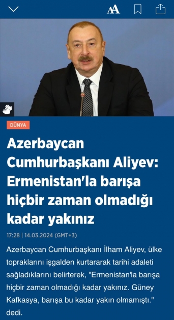 İlham Əliyevin sitatına istinadla qeyd edilib ki, indi Azərbaycan Ermənistanla sülhə heç vaxt görünmədiyi qədər yaxındır. “Cənubi Qafqazda müstəqillik tarixində sülh bu qədər yaxın olmamışdır. Bu da İkinci Qarabağ müharibəsinin nəticəsidir”, - deyə məqalələrdə Azərbaycan Prezidentinin fikirlərinə istinadla vurğulanıb.