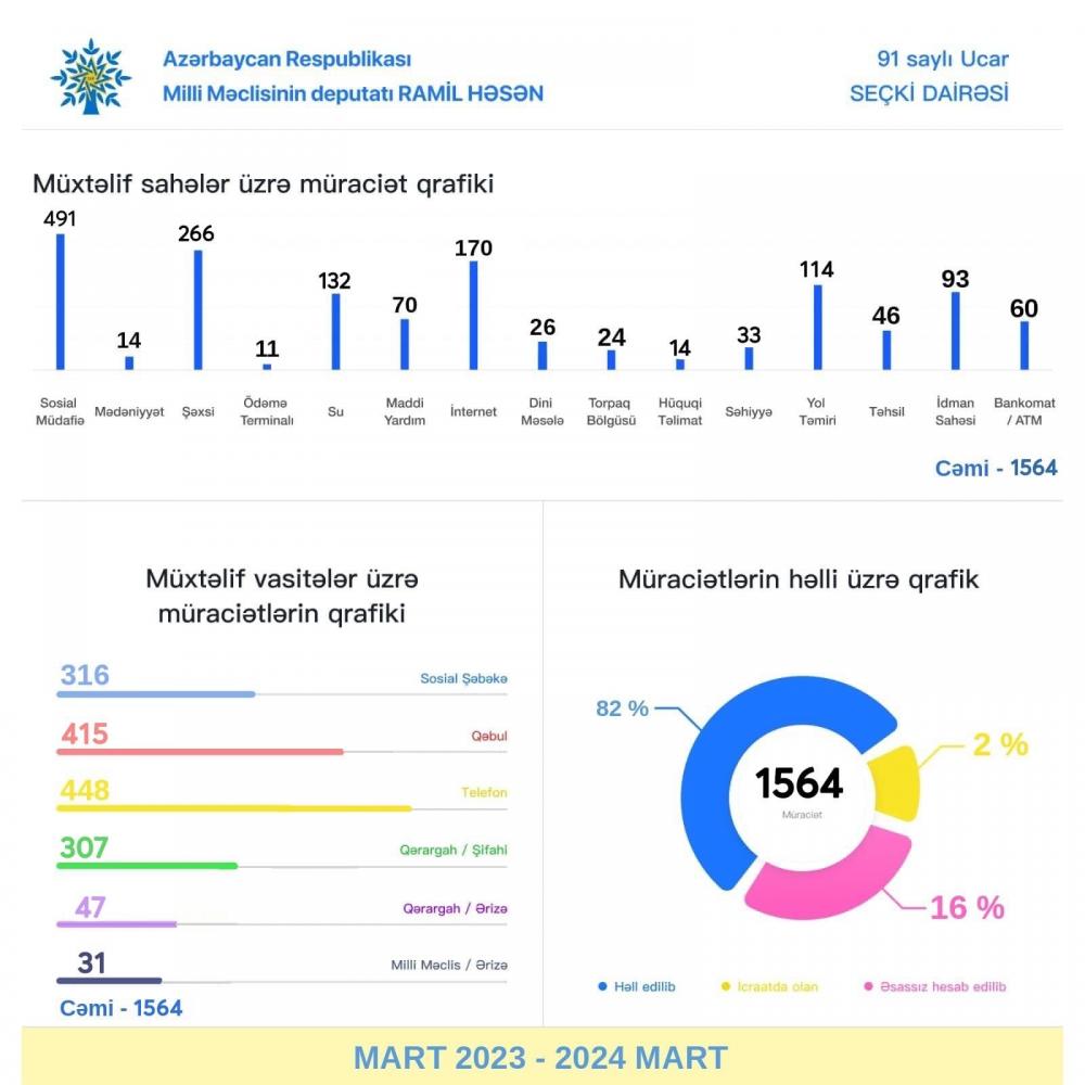 Deputat olaraq fəaliyyətə başladığım ilk gündən etibarən çalışmışam ki, seçicilərin qaldırdığı məsələlərə diqqətlə yanaşaraq hər bir vətəndaşın, hər bir seçicinin üzləşdiyi çətinliklərin aradan qaldırılmasında öz köməyimi əsirgəməyim. Ötən dövr ərzində də seçicilərimlə sıx təmasda olmuş, 448 nəfərin müraciətini telefon danışığı vasitəsilə, 2023-cü ilin dekabr ayının sonunadək 268 nəfərin, 2024-cü ilin yanvar, fevral və mart aylarında 39 nəfərin müraciətini dinləmiş, beləliklə də ümumilikdə 755 nəfərin şifahi müraciətini dinləmişəm.