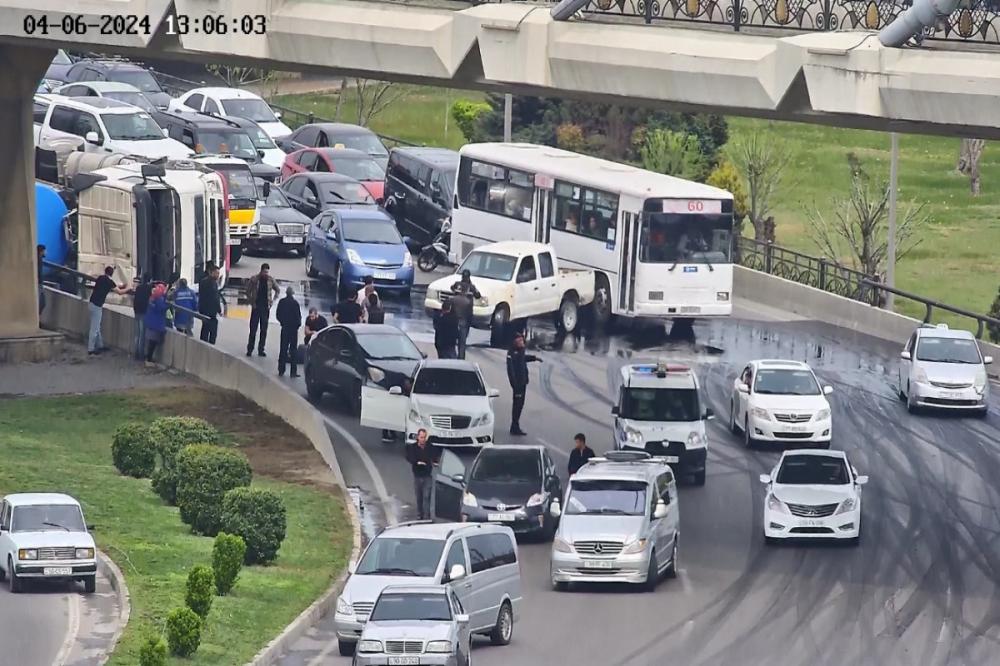 Bakıda yük avtomobilinin aşması nəticəsində yola maye dağılıb